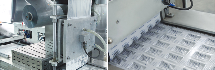 4、設備中部(封口和真空區域) 由封口模具和上加熱模具,設備通過步進到達封口真空區域,下膜模具通過氣缸上升、壓緊上加熱模具,再通過真空管路進行抽真空,最后完成封口。 |